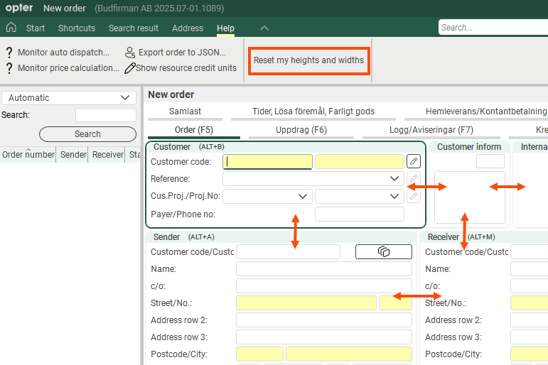 Users who have made their own size adjustments will retain them, but if they click the Reset my heights and widths button (in the order reception under Help), your current size adjustments will take precedence. (If they subsequently make their own adjustments, Opter will automatically save those adjustments for each order setting, user and computer.)