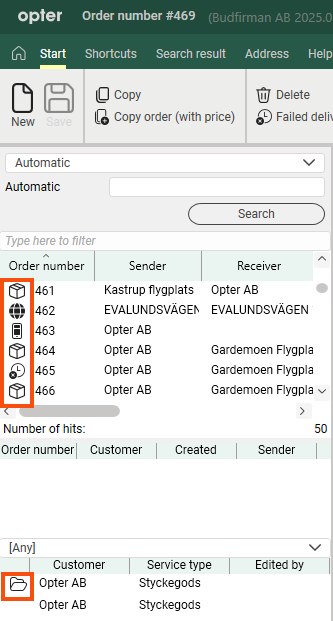 On the far left of Order reception, icons can be displayed so that you can quickly see which orders are Internet orders, consignment orders, Failed deliveries, and which orders are currently open with someone else, for example. The picture shows what the Order reception might look like in the new design. (Opter in new design is available from 2025.12.00 and 2025.07.831+.)