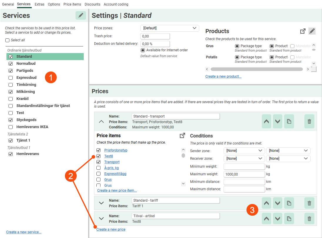 When you create an order in Opter, you select a service on the order. The service is priced with one or more Price items. This is how you price the services in a price list: