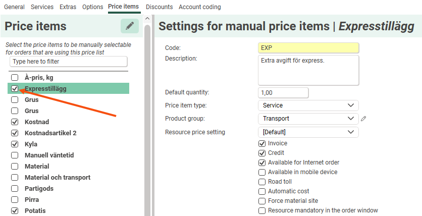 On the Price items tab of the price list, select the Price items that can be manually added to an order by ticking them in the list. The Price item can then be added to the item rows in Order reception. To make them also available on the web portals and in Opter Driver, select Available for Internet order and Available in mobile device respectively.