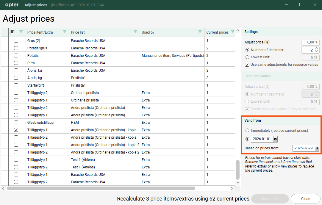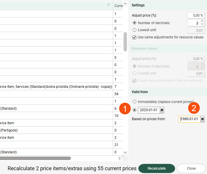 Click on Economy > Adjust prices and select the Price items to be re-priced from the list (it is not possible to create new price generations for extras). Select when the new prices will take effect in the first date field at Valid from, and which prices the adjustment will be based on in the second date field. In other words, you do not choose to base them on a particular price generation, but on the prices in force/valid on a particular date.
