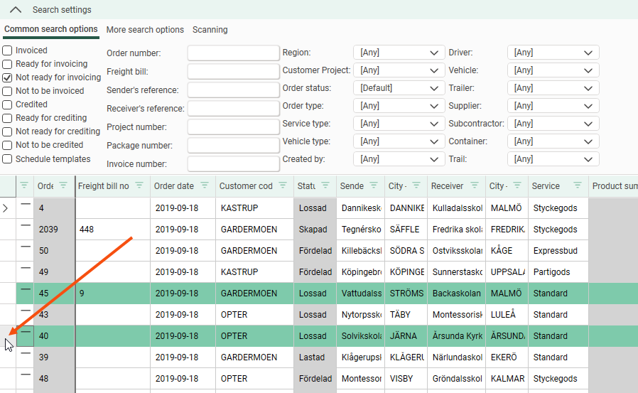 Open the order check and search for the orders for which prices are to be recalculated. If you do not want to recalculate all the orders in the order list, you can select individual orders by clicking on the leftmost row (Ctrl- or Shift-click to select multiple rows).