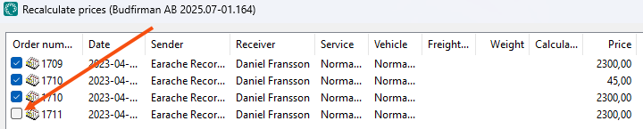 Right-click on it and select Recalculate prices. A list of all the orders covered by the invoice is displayed. If there is an order in the list for which you do not want to recalculate the price, deselect it.