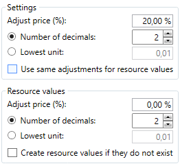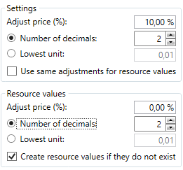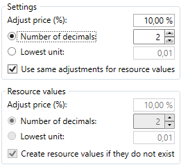 If customer prices and resource values are adjusted by different amounts, there is an option to add new resource values to the price matrix if they are missing somewhere, by selecting Create resource values if they do not exist. The new resource value is based on the old customer price and the percentage adjustment. If the customer price was 100 and the resource values are to be adjusted by 10%, the new resource value that is added to the matrix will be "110" (the original customer price 100 + 10%).