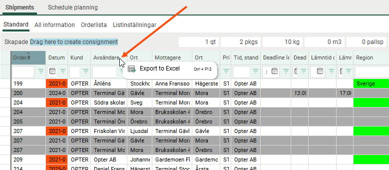 Most registers and lists can now be exported to Excel, such as dispatch shipments and tariffs. In the registers, the option is available on the menu as before. In lists, right-click and select Export to Excel.