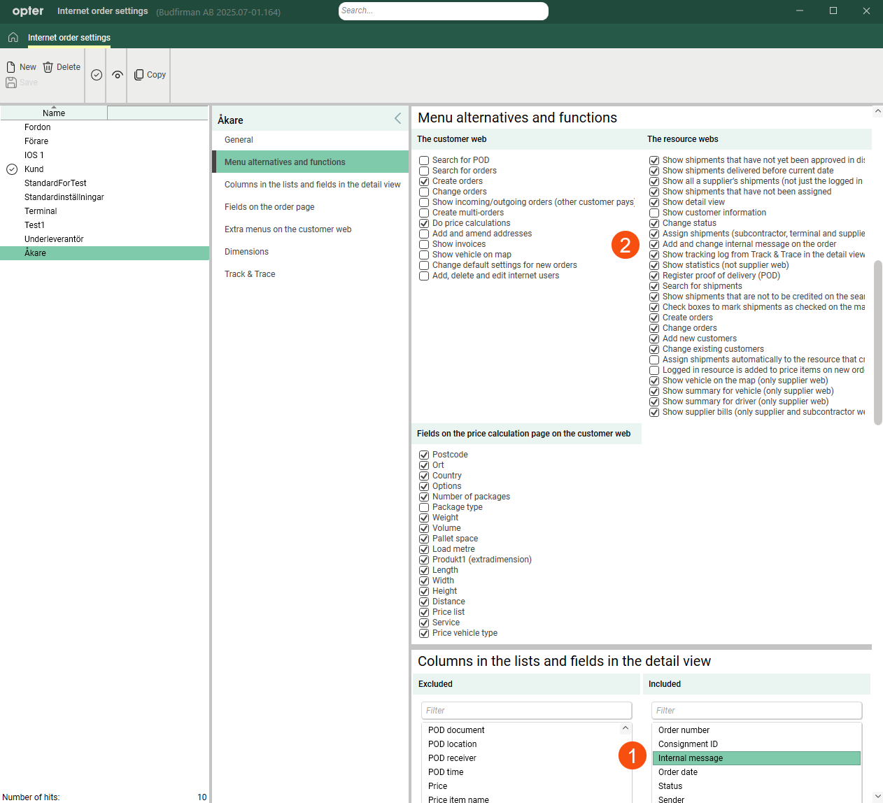 If you also want the carrier/subcontractor to be able to edit and add internal messages, tick Add and change internal message on the order under The resource webs on the tab Menu alternatives and functions.