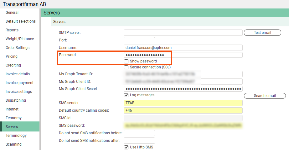 The password for the SMTP server on the Servers tab in the Office settings is now hidden, but it can be displayed by ticking a box. The same applies to passwords for EDI transactions.