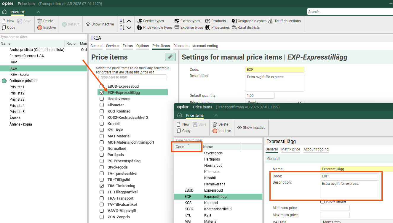 You can now enter the code and description for price items directly in the item register, where you can also sort by item code. The Price items tab in the price list now also displays the code in the name of the price item.