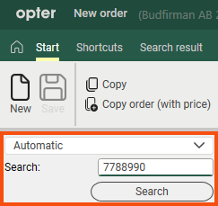 Select Automatic and enter the order number, invoice number, consignment note number, parcel number, sender reference, recipient reference or extra ID 1–extra ID 5 in the search field. Press Search or Enter. Opter then searches through orders with order dates from the last three months.