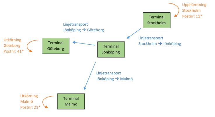 A route in Opter is like a transport schedule or timetable. For example, you can set up a route consisting of pickups from a few different postcode areas, line haul services between three terminals where goods are transhipped and finally delivery at a location, similar to the illustration below.