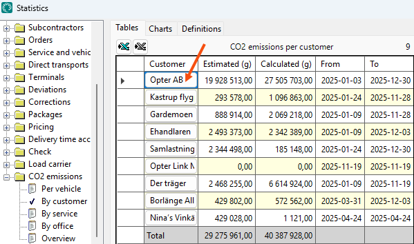 For example, if you selected By customer, the estimated and calculated CO2 emissions for each customer for the period you selected are shown.