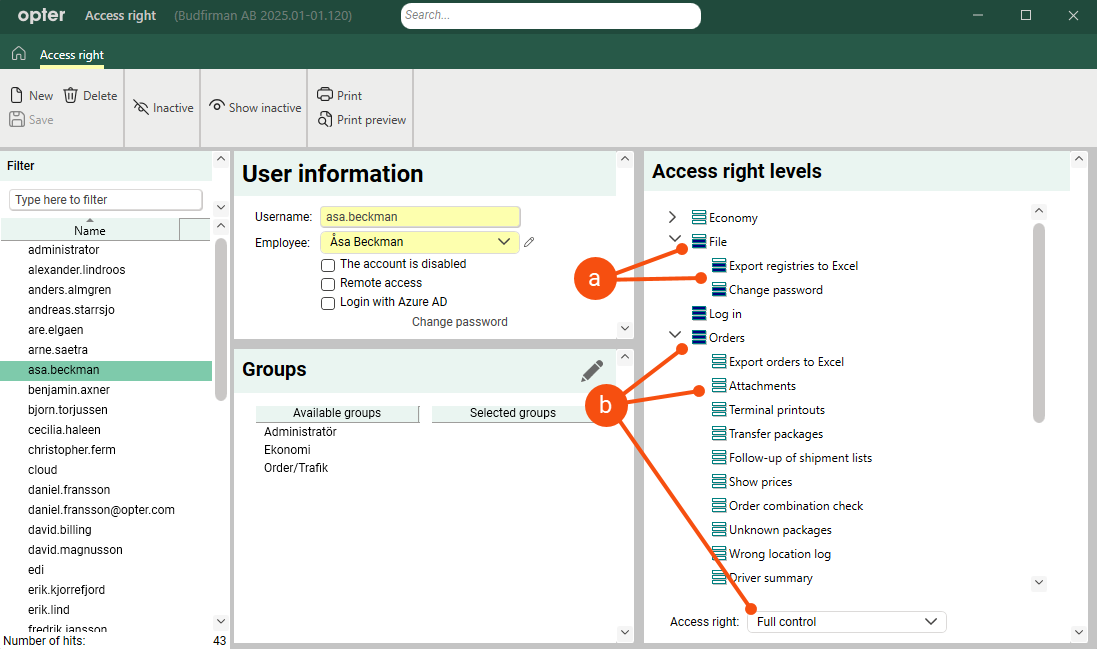 It is also possible to mark a function and select an access right in the Access right drop-down list at the bottom of the window. If you do it at a parent level, the authorisation for the child functions on that menu will not apply, so you will also need to set the authorisation for the individual functions that users should have. In the image below, Full control has been set at the Orders level, but users are not authorised to access these child functions (b).