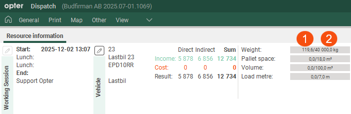 The standard dimensions and any additional dimensions are shown in box Resource information in the dispatch system. At (2) in the image below, the value you have entered in, for example, field Weight on tab Capacity in the vehicle register is displayed; alternatively, the value in, for example, field Weight on tab Capacity in the register for vehicle types is displayed.