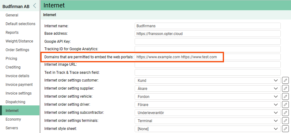 Enter the full URL of the domain where the portal will be embedded in the Domains that are permitted to embed the web portals field of the Internet tab in the office settings. You can enter multiple domains separated by spaces, for example if you have different domains for customers and hauliers.