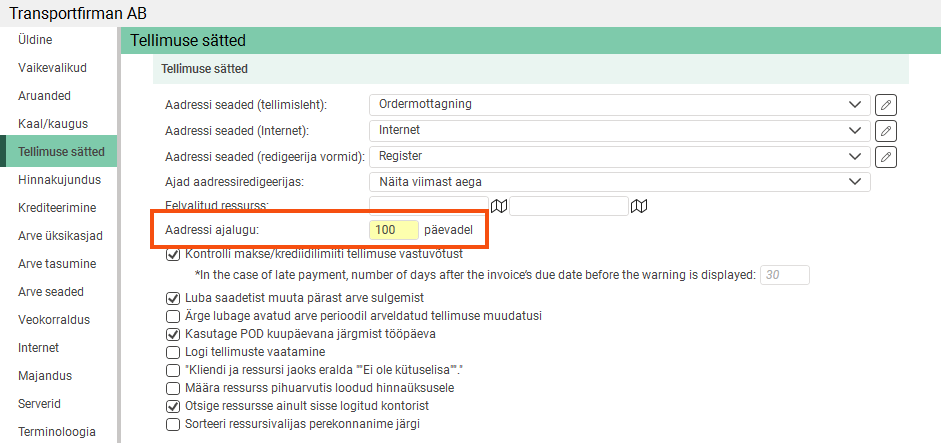 Click on Seaded > Kontorid and go to the Tellimuse sätted tab. In the Aadressi ajalugu text field, enter the number of days addresses should be saved after they have been used.