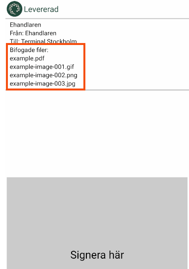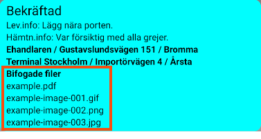 To let drivers know that there are attachments in the shipment, a list of the file names can be added to the shipment lists (Uus, Töös and Valmis), detail view and POD view.
