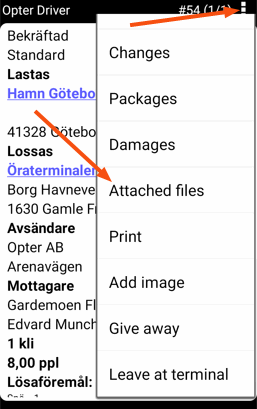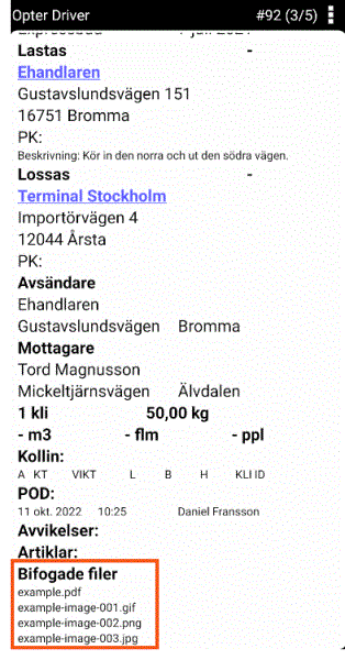 It can be set so that the driver is able to view and download files that have been attached to an order. JPG and PNG files can be opened directly in Opter Driver, or downloaded to your mobile phone. BMP, GIF, TIF and PDF files can be downloaded and then opened in another app that can handle those formats.