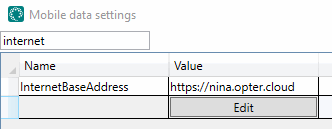 Select InternetBaseAddress from the list and enter the URL of the customer web in the Väärtus column. For example, the URL may be “https://expresstransport.no/opter” or “https://expresstransport.opter.cloud” (if you are using the Opter cloud solution). For more information, seeCustomer web and Track & Trace.
