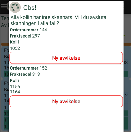 Press New deviation on the page with the question Some packages have not been scanned. Do you want to end the scanning anyway? (The page appears after you have scanned parcels, but not all parcels in the shipment/order, and then pressed Done).