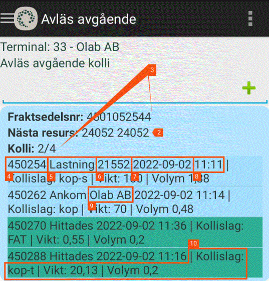 If you set onescanrow="true" in step 2 above, you can further customise the block in the scan list by selecting true or false for the rest of the settings on the same line in Terminal.Settings. The information is also displayed for the packages that the user has not scanned on the shipment. Scanned packages are coloured green in the block.
