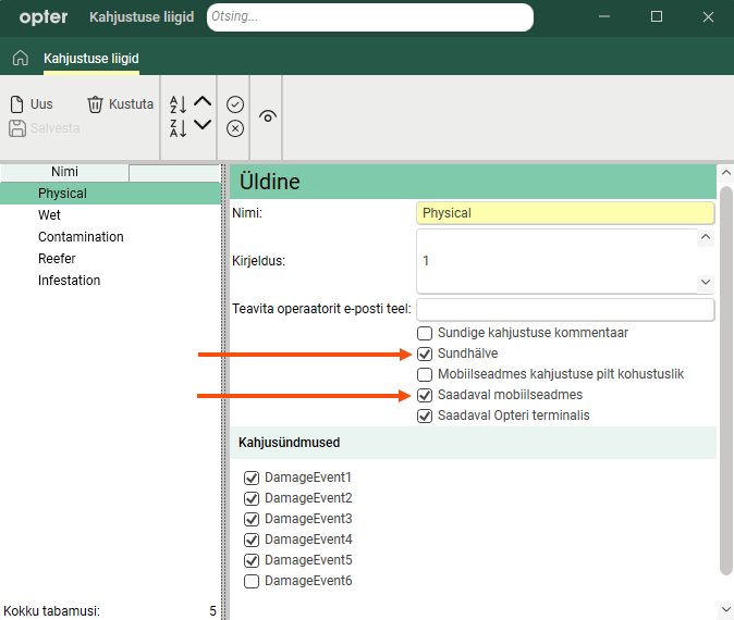 You set which deviation types, deviation events and deviation reasons are available in Opter Driver by selecting Saadaval mobiilseadmes in the respective register under Seaded > Kahjud.