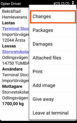 By default, the driver can make changes to the shipments in Opter Driver by selecting Changes from the menu. This can be useful if, for example, the number of packages or the driving time is not correct. You can set up so that drivers cannot change the shipments in the app by setting the Mobile data settings ChangesPermission to "False".