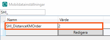 Click on an empty row in the Nimi column and then on the down arrow in the row being added. Select the SHI_XyzPermission setting for the field to be displayed/hidden, for example SHI_DistanceKMPermission (which controls whether the Kaugus/Distance (km) field is displayed or not). For more information on which settings correspond to which fields, see Mobiilse andmeside seaded (window).