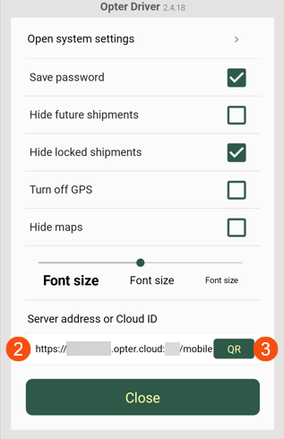 Enter your cloud ID (cloud name) in the Server address or Cloud ID field (2). The Cloud ID is your company name as it appears in Opter, for example “the courier company”. There must be no spaces in or after the name.