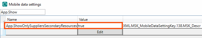 Select the setting you wish to configure from the list, for example App.ShowOnlySuppliersSecondaryResources. Enter “true” or “false” in the column Väärtus.