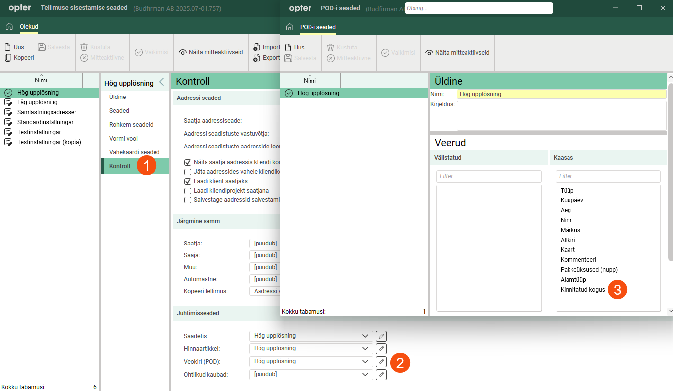 If the column Kinnitatud pakkeüksused is not displayed in the Order reception, you can find it in the order settings. Go to the Kontroll tab (1), click on next to the Veokiri (POD) drop-down menu (2) and move Kinnitatud kogus to Kaasas (3).