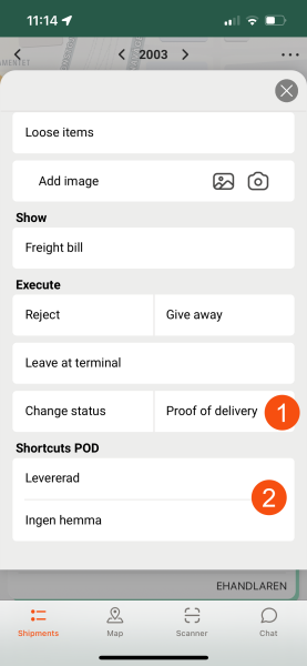 The option Proof of delivery is always displayed by default on the menu in the detail view (1). If you want to hide it, set the Mobile data settings ProofOfDeliveryPermission to "false". You can also add shortcuts to common POD-types directly on the menu by selecting Display on the menu in Opter Driver on that POD-type (2).