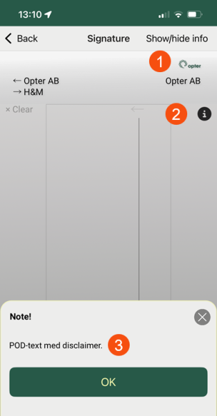 You can display the customer's logo on the signature page (1) by selecting an image on the Veokiri (POD) tab of the customer register, and then adding the field Customer logo [CUSTOMERLOGOTYPE] on the Proof of delivery tab of Design field for mobile, or with the tag CUSTOMERLOGOTYPE in App.OpterDriver.Design.