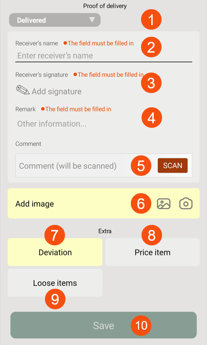 In the image above, the driver selects the proof of delivery type (1), enters the consignee's name (2), adds the signature (3), remark (4), possible comment (5), image (6), deviation (7), possible Price items (8) and loose items (9) and then saves the proof of delivery (10). For more information, see Pods (POD) in Opter Driver.