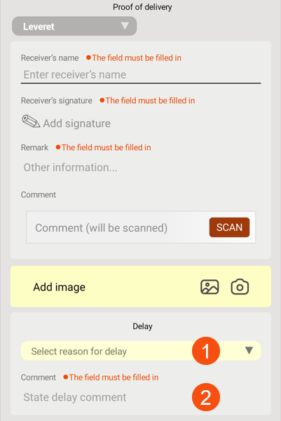 In Opter Driver for iOS and Opter Driver Labs for Android, the reason is entered in the POD view where the driver selects a delay reason (1) and writes a comment (2). It is not possible to save the pod until the reason and comment have been filled in.