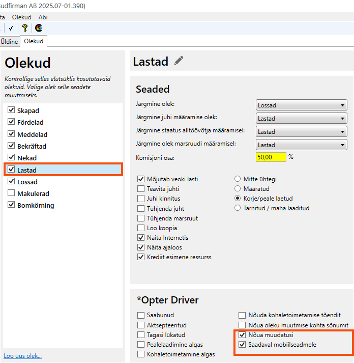 Select the status whose setting needs to be configured under Olekud, for example Korjatud. (See picture below).