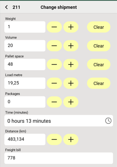 The driver must press the Changes button, change to Kaal, Maht or Kaubaaluste kohti, for example, and then press Salvesta.