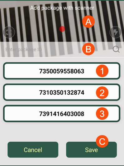 Scan the parcel label (A) or enter the parcel number manually (B).