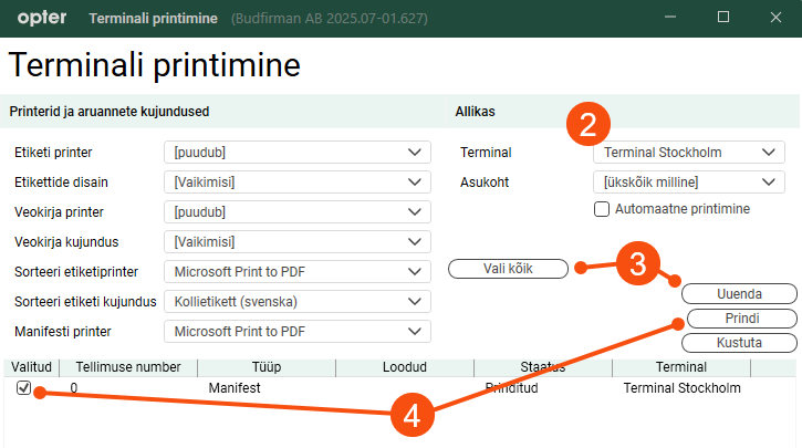 When drivers depart from the Terminal, they can send a request to Opter to print out the assignment list when they are done. The task list is printed from the Terminali printimine window in Opter.