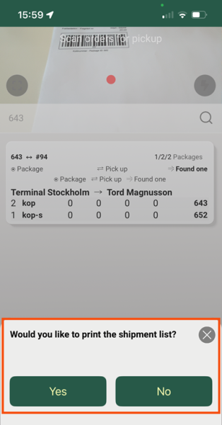 The driver scans the parcels as usual. When it is finished, you will be asked if the job list should be printed. If the driver replies to Yes, the list is not printed directly but sent to Opter, where it can be printed as a PDF or on paper.