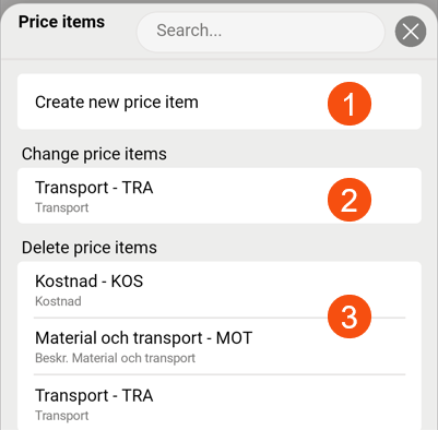 Add price items, for example if carrying out an extra service in connection with the delivery. (See 1 in the picture below.)