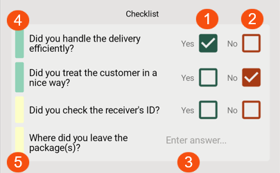 Green colour for question (4) means that it has been answered. You can change the answer until you click on Save at the bottom of the page. Yellow (5) means that you must answer the question before you can save the proof of delivery.