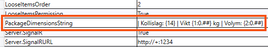 Add the mobile data setting PackageDimensionsString and enter “| Package type: {14} | Weight {1:0.##} kg | Volume: {2:0.##}" in the Väärtus column. The variables ({0}-{15}) take their values from the package rows.