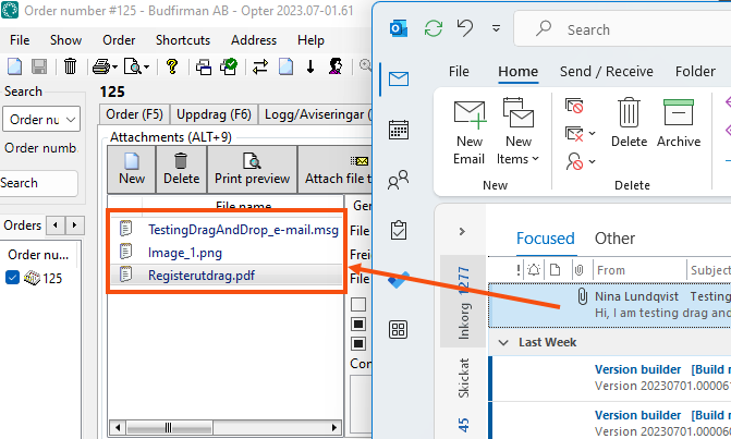 The picture shows how to attach an email from Outlook to an order in order reception using the drag and drop function. The email has two attachments, a PNG file and a PDF file.