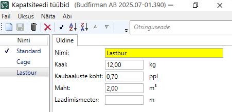 , give the load type a name and then enter the weight, Pallet space, volume and/or load metre for the load type. Click on Salvesta to save all changes.
