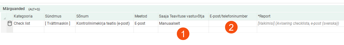 The customer can also receive a notification when the checklist has been completed. Select the method in Teavitage klienti, kui olete lõpetanud and a notification will be created on the order. You must select a notification recipient (1), or enter an email address/telephone number (2), on the notification in Order reception. Otherwise it won't go away. For more information, see Märguanded (order reception).