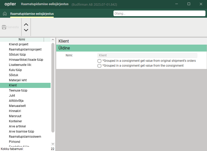 Shipments can be automatically grouped into shipments in two different ways. Either according to a number of criteria specified in the Saadetise liigid window, or according to a number of predefined criteria. For more information, see Automatic creation of consignments.