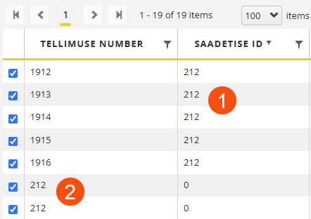 It is possible to show which shipments are included in consignment orders by including the Saadetise ID column on the Tellimuse otsing tab of the internet order settings (1). The actual consignment shipments are also shown as regular shipments (2).