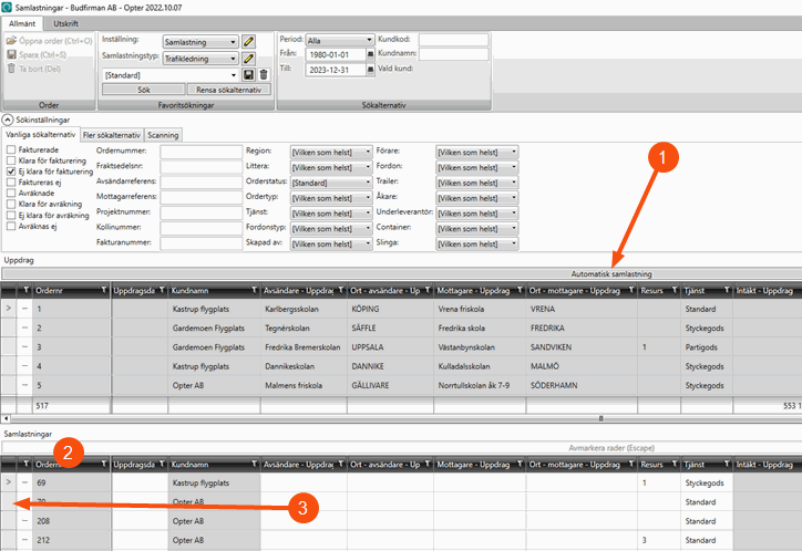 Although it is called “automatic creation of consignments”, the consignment order must be created manually. What is automatic is the choice of which shipments to group into a consignment. The consignment function goes through shipments based on the settings in the consignment type. It does not matter what searches have been made or which shipments and consignments are displayed in the Saadetised window.