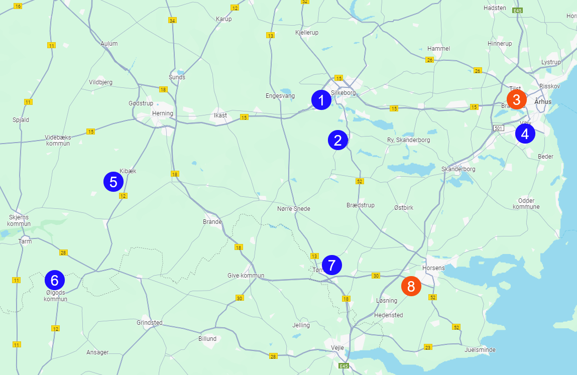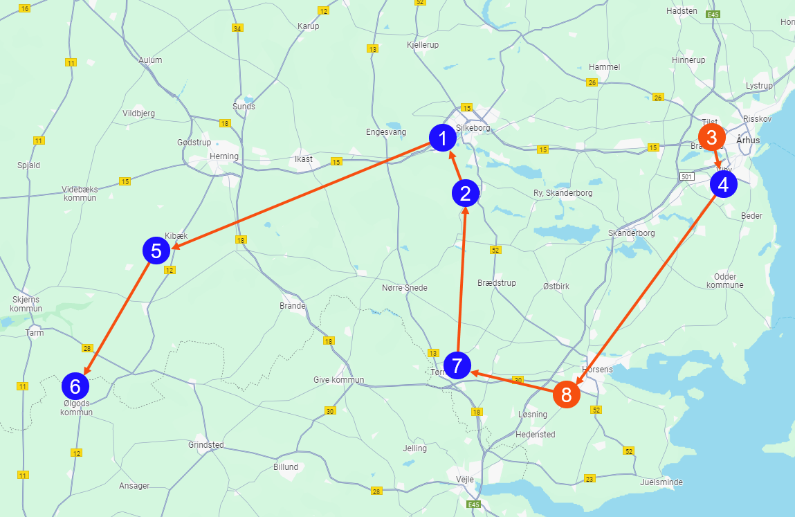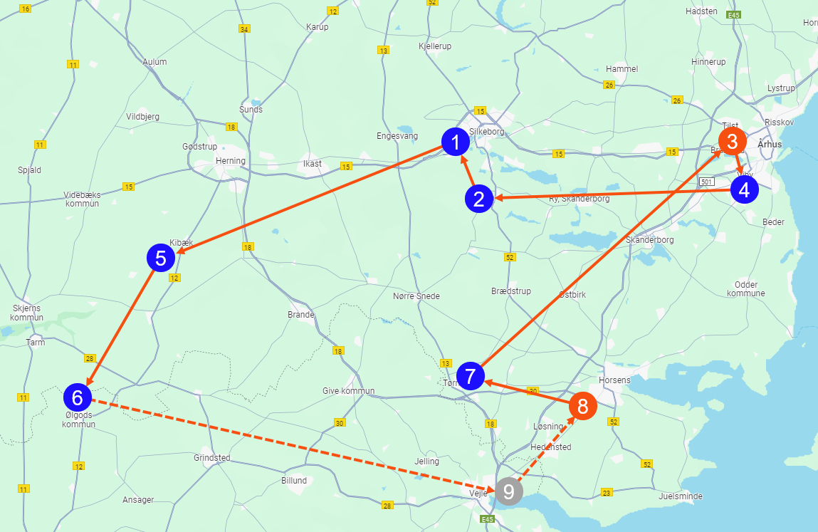 If we instead say that the calculation should take into account that the working session starts and ends at the driver's home address in Vejle (9), the route sequence becomes 8-7-3-4-2-1-5-6. The address is not added as the first and last stop in the address list, but the route sequence is changed to best include the desired start and end address.