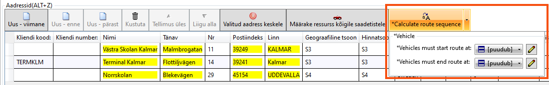 All the stops on the consignment order are listed under Aadressid (located by default on the Saadetised tab). Click on Calculate route sequence to put the addresses in an optimal sequence.